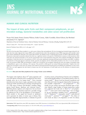 Eid, N., Enani, S., Walton, G. orcid id iconORCID: https://orcid.org/0000-0001-5426-5635, Corona, G., Costabile, A., Gibson, G. orcid id iconORCID: https://orcid.org/0000-0002-0566-0476, Rowland, I. and Spencer, J. P. E. orcid id iconORCID: https://orcid.org/0000-0003-2931-7274 (2014) The impact of date palm fruits and their component polyphenols, on gut microbial ecology, bacterial metabolites and colon cancer cell proliferation. Journal of nutritional science, 3. e46. ISSN 2048-6790 doi: 10.1017/jns.2014.16