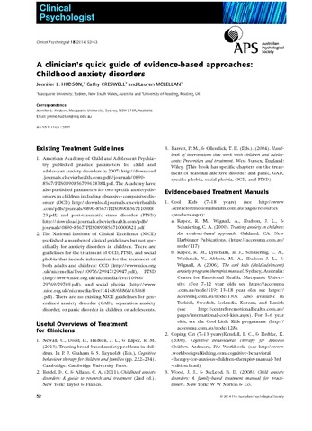 Hudson, J. L., Creswell, C. and McLellan, L. (2014) A clinician's quick guide of evidence based approaches: childhood anxiety disorders. Clinical Psychologist, 18 (1). pp. 52-53. ISSN 1097-4679 doi: 10.1111/cp.12037