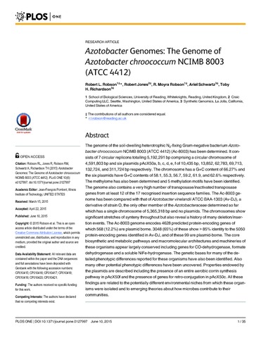 Robson, R. L., Jones, R., Robson, R. M., Schwartz, A. and Richardson, T. H. (2015) Azotobacter genomes: the genome of Azotobacter chroococcum NCIMB 8003 (ATCC 4412). PLoS ONE, 10 (6). e0127997. ISSN 1932-6203 doi: 10.1371/journal.pone.0127997