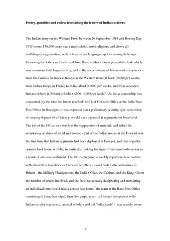 Footitt, H. (2016) Poetry, parables and codes: translating the letters of Indian soldiers. In: Walker, J. and Declercq, C. (eds.) Languages and the First World War: communicating in a transnational war. Palgrave Studies in Languages at War. Palgrave Macmillan, Basingstoke. ISBN 9781137550354