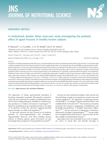 Ramnani, P., Costabile, A., Bustillo, A. G. R. and Gibson, G. R. orcid id iconORCID: https://orcid.org/0000-0002-0566-0476 (2015) A randomised, double- blind, cross-over study investigating the prebiotic effect of agave fructans in healthy human subjects. Journal of Nutritional Science, 4. e10. ISSN 2048-6790 doi: 10.1017/jns.2014.68