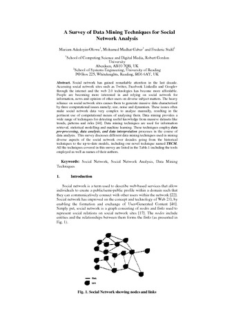 Social network has gained remarkable attention in the last decade. Accessing social network sites such as Twitter, Facebook LinkedIn and Google+ through the internet and the web 2.0 technologies has become more affordable. People are becoming more interested in and relying on social network for information, news and opinion of other users on diverse subject matters. The heavy reliance on social network sites causes them to generate massive data characterised by three computational issues namely; size, noise and dynamism. These issues often make social network data very complex to analyse manually, resulting in the pertinent use of computational means of analysing them. Data mining provides a wide range of techniques for detecting useful knowledge from massive datasets like trends, patterns and rules [44]. Data mining techniques are used for information retrieval, statistical modelling and machine learning. These techniques employ data pre-processing, data analysis, and data interpretation processes in the course of data analysis. This survey discusses different data mining techniques used in mining diverse aspects of the social network over decades going from the historical techniques to the up-to-date models, including our novel technique named TRCM. All the techniques covered in this survey are listed in the Table.1 including the tools employed as well as names of their authors.