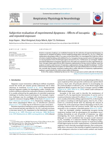Hayen, A., Herigstad, M., Wiech, K. and Pattinson, K. T. S. (2015) Subjective evaluation of experimental dyspnoea: effects of isocapnia and repeated exposure. Respiratory Physiology & Neurobiology, 208. pp. 21-28. ISSN 1569-9048 doi: 10.1016/j.resp.2014.12.019