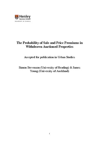 Stevenson, S. and Young, J. (2015) The probability of sale and price premiums in withdrawn auctioned properties. Urban Studies, 52 (2). pp. 279-297. ISSN 1360-063X doi: 10.1177/0042098014529341