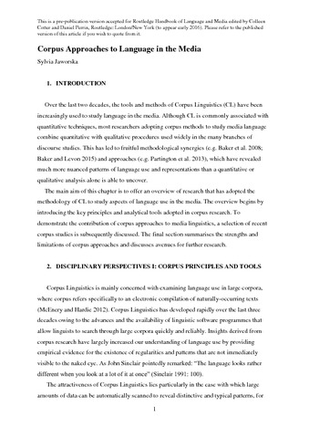 The main aim of this chapter is to offer an overview of research that has adopted the methodology of Corpus Linguistics to study aspects of language use in the media. The overview begins by introducing the key principles and analytical tools adopted in corpus research. To demonstrate the contribution of corpus approaches to media linguistics, a selection of recent corpus studies is subsequently discussed. The final section summarises the strengths and limitations of corpus approaches and discusses avenues for further research.