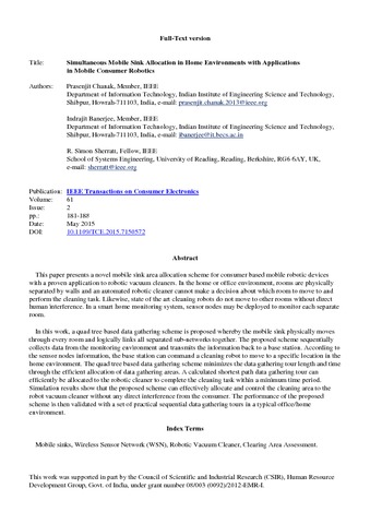 Chanak, P., Banerjee, I. and Sherratt, R. S. orcid id iconORCID: https://orcid.org/0000-0001-7899-4445 (2015) Simultaneous mobile sink allocation in home environments with applications in mobile consumer robotics. IEEE Transactions on Consumer Electronics, 61 (2). pp. 181-188. ISSN 0098-3063 doi: 10.1109/TCE.2015.7150572
