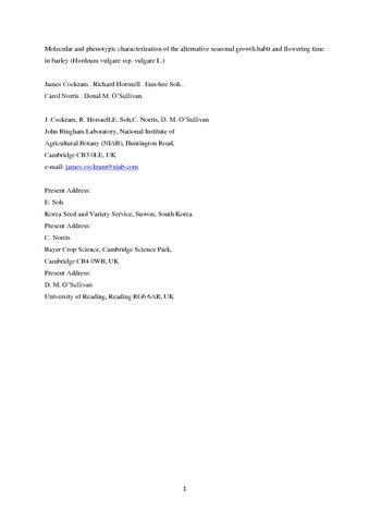 Cockram, J., Horsnell, R., Soh, E.-h., Norris, C. and O'Sullivan, D. orcid id iconORCID: https://orcid.org/0000-0003-4889-056X (2015) Molecular and phenotypic characterization of the alternative seasonal growth habit and flowering time in barley (Hordeum vulgare ssp. vulgare L.). Molecular Breeding, 35 (8). 165. ISSN 1380-3743 doi: 10.1007/s11032-015-0359-5