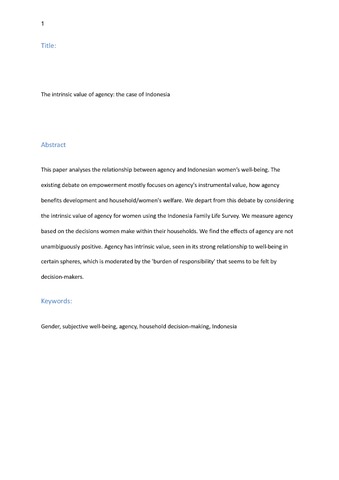 Fernandez, A., Della Giusta, M. orcid id iconORCID: https://orcid.org/0000-0003-3959-4451 and Kambhampati, U. orcid id iconORCID: https://orcid.org/0000-0001-5906-2394 (2015) The intrinsic value of agency: the case of Indonesia. World Development, 70 (C). pp. 92-107. ISSN 0305-750X doi: 10.1016/j.worlddev.2014.12.020