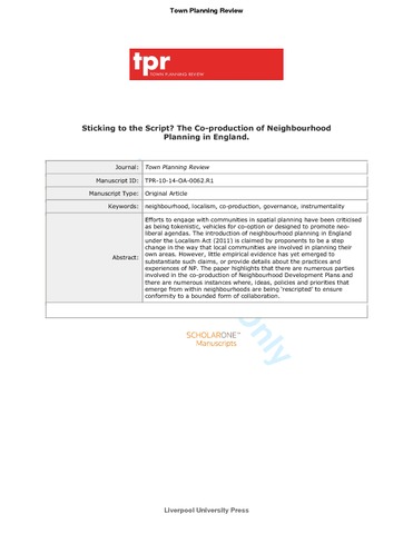 Efforts to engage with communities in spatial planning have been criticised as being tokenistic, vehicles for co-option or designed to promote neo-liberal agendas. The introduction of neighbourhood planning (NP) in England under the Localism Act (2011) is claimed by proponents to be a step change in the way that local communities are involved in planning their own areas. However, little empirical evidence has yet emerged to substantiate such claims, or provide details about the practices and experiences of NP. The paper highlights that there are numerous parties involved in the co-production of Neighbourhood Development Plans and there are numerous instances where ideas, policies and priorities that emerge from within neighbourhoods are being ‘rescripted’ to ensure conformity to a bounded form of collaboration.