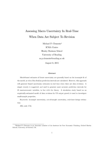 Clements, M. P. orcid id iconORCID: https://orcid.org/0000-0001-6329-1341 (2017) Assessing macro uncertainty in real-time when data are subject to revision. Journal of Business & Economic Statistics, 35 (3). pp. 420-433. ISSN 0735-0015 doi: 10.1080/07350015.2015.1081596