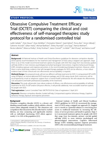 Gellatly, J., Bower, P., McMillan, D., Roberts, C., Byford, S., Bee, P., Gilbody, S., Arundel, C., Hardy, G., Barkham, M., Reynolds, S., Gega, L., Mottram, P., Lidbetter, N., Pedley, R., Peckham, E., Connell, J., Molle, J., O’Leary, N. and Lovell, K. (2014) Obsessive Compulsive Treatment Efficacy Trial (OCTET) comparing the clinical and cost effectiveness of self-managed therapies: study protocol for a randomised controlled trial. Trials, 15 (1). 278. ISSN 1745-6215 doi: 10.1186/1745-6215-15-278
