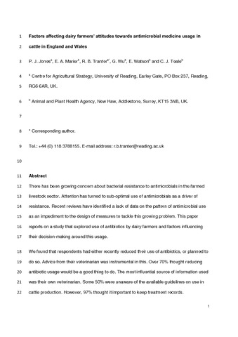 Factors affecting dairy farmers' attitudes towards antimicrobial medicine usage in cattle in England and Wales.