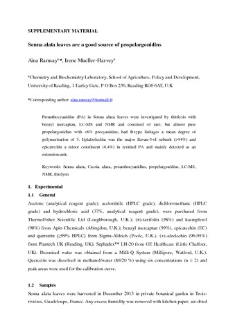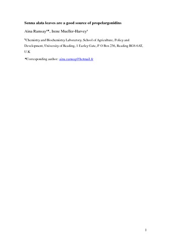 Ramsay, A. and Mueller-Harvey, I. (2016) Senna alata leaves are a good source of propelargonidins. Natural Product Research, 30 (13). pp. 1548-1551. ISSN 1478-6419 doi: 10.1080/14786419.2015.1108976