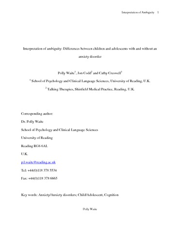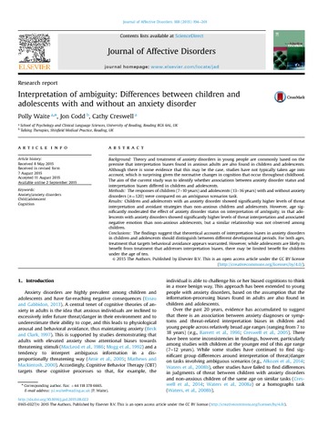 Interpretation of ambiguity: differences between children and adolescents with and without an anxiety disorder.