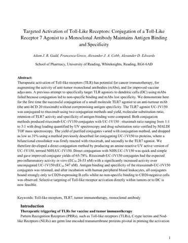 Targeted activation of toll-like receptors: conjugation of a toll-like receptor 7 agonist to a monoclonal antibody maintains antigen binding and specificity.