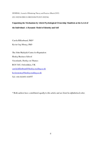 Hillenbrand, C. orcid id iconORCID: https://orcid.org/0000-0002-2929-5098 and Money, K. G. (2015) Unpacking the mechanism by which psychological ownership manifests at the level of the individual: a dynamic model of identity and self. Journal of Marketing Theory and Practice, 23 (2). pp. 148-165. ISSN 1069-6679 doi: 10.1080/10696679.2015.1002334