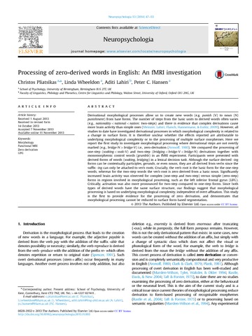 Derivational morphological processes allow us to create new words (e.g. punish (V) to noun (N) punishment) from base forms. The number of steps from the basic units to derived words often varies (e.g., nationality<national<nation: two-steps) and there is evidence that complex derivations cause more brain activity than simple ones ( Meinzer, Lahiri, Flaisch, Hannemann, & Eulitz, 2009). However, all studies to date have investigated derivational processes in which morphological complexity is related to a change in surface form. It is therefore unclear whether the effects reported are attributable to underlying morphological complexity or to the processing of multiple surface morphemes. Here we report the first study to investigate morphological processing where derivational steps are not overtly marked (e.g., bridge-N>bridge-V) i.e., zero-derivation ( Aronoff, 1980). We compared the processing of one-step (soaking<soak-V) and two-step (bridging<bridge-V<bridge-N) derivations together with monomorphemic control words (grumble) in an fMRI experiment. Participants were presented with derived forms of words (soaking, bridging) in a lexical decision task. Although the surface derived -ing forms can be contextually participles, gerunds, or even nouns, they are all derived from verbs since the suffix -ing can only be attached to verb roots. Crucially, the verb root is the basic form for the one-step words, whereas for the two-step words the verb root is zero derived from a basic noun. Significantly increased brain activity was observed for complex (one-step and two-step) versus simple (zero-step) forms in regions involved in morphological processing, such as the left inferior frontal gyrus (LIFG). Critically, activation was also more pronounced for two-step compared to one-step forms. Since both types of derived words have the same surface structure, our findings suggest that morphological processing is based on underlying morphological complexity, independent of overt affixation. This study is the first to provide evidence for the processing of zero derivation, and demonstrates that morphological processing cannot be reduced to surface form-based segmentation.
