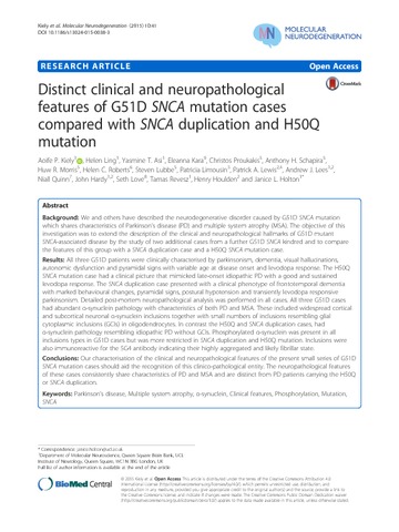 Kiely, A., Ling, H., Asi, Y., Kara, E., Proukakis, C., Schapira, A., Morris, H., Roberts, H., Lubbe, S., Limousin, P., Lewis, P., Lees, A., Quinn, N., Hardy, J., Love, S., Revesz, T., Houlden, H. and Holton, J. (2015) Distinct clinical and neuropathological features of G51D SNCA mutation cases compared with SNCA duplication and H50Q mutation. Molecular Neurodegeneration, 10 (1). 41. ISSN 1750-1326 doi: 10.1186/s13024-015-0038-3