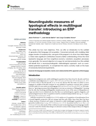 Rothman, J., Alemán Bañón, J. and González Alonso, J. (2015) Neurolinguistic measures of typological effects in multilingual transfer: introducing an ERP methodology. Frontiers in Psychology, 6. 1087. ISSN 1664-1078 doi: 10.3389/fpsyg.2015.01087