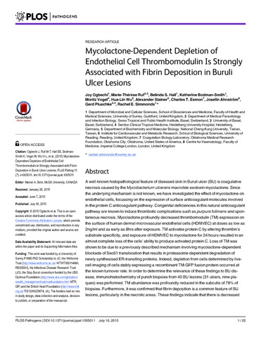 Behr, M. A., Ogbechi, J., Ruf, M.-T., Hall, B. S., Bodman-Smith, K., Vogel, M., Wu, H.-L., Stainer, A., Esmon, C. T., Ahnström, J., Pluschke, G. and Simmonds, R. E. (2015) Mycolactone-dependent depletion of endothelial cell thrombomodulin is strongly associated with fibrin deposition in buruli ulcer lesions. PLoS Pathogens, 11 (7). e1005011. ISSN 1553-7374 doi: 10.1371/journal.ppat.1005011