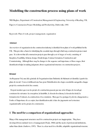 An overview of organization in the construction industry is identified from plans of work published in the UK. This provides a basis for identifying the essential steps through which any construction project must pass. It is shown that all construction projects pass through a set of stages of work, consisting of inception, feasibility, scheme design, detail design, contract formation, construction and commissioning. Although there may be changes to the sequence and importance of these stages, their identification helps in making judgements about organizational structure on construction projects.