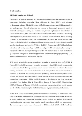 This paper reports findings from six field courses about student’s perceptions of iPads as mobile learning devices for fieldwork. Data were collected through surveys and focus groups. The key findings suggest that the multi-tool nature of the iPads and their portability were the main strengths. Students had some concerns over the safety of the iPads in adverse weather and rugged environments, though most of these concerns were eliminated after using the devices with protective cases. Reduced connectivity was found to be one of the main challenges for mobile learning. Finally, students and practitioners views of why they used the mobile devices for fieldwork did not align.