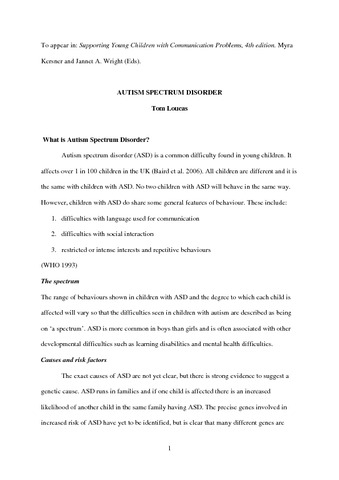 Loucas, T. orcid id iconORCID: https://orcid.org/0000-0001-8130-6690 (2015) Autism spectrum disorder. In: Kersner, M. and Wright, J. A. (eds.) Supporting young children with communication problems. 4th edition. Routledge, Abingdon, pp. 104-118. ISBN 9781138779211