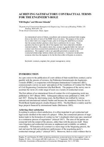 An international survey of clients, consultants and contractors produced wide-ranging data on the views of users of the FIDIC form of contract. The purpose of the survey was to elicit views on a range of issues, prior to revising the model form, to ensure that the contract drafters produce a form that is satisfactory for its users. Those questions that focus upon the role of the engineer have been subjected to detailed statistical analysis. The analysis shows that, contrary to popular belief, the views of contract users from common law jurisdictions do not differ from those in civil code jurisdictions. The engineer’s role is not generally perceived as neutral in the contractual relationships between clients and contractors. Contractors would prefer someone other than the engineer to be the first-line settler of disputes in contracts.
