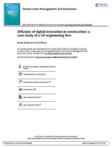 Shibeika, A. orcid id iconORCID: https://orcid.org/0000-0003-0226-9241 and Harty, C. (2015) Diffusion of digital innovation in construction: a case study of a UK engineering firm. Construction Management and Economics, 33 (5-6). pp. 453-466. ISSN 0144-6193 doi: 10.1080/01446193.2015.1077982