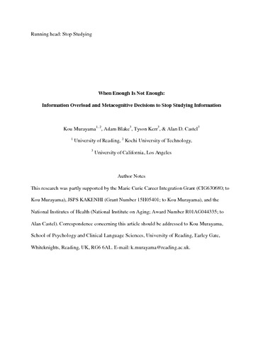 Murayama, K., Blake, A. B., Kerr, T. and Castel, A. D. (2016) When enough is not enough: information overload and metacognitive decisions to stop studying information. Journal of Experimental Psychology: Learning, Memory & Cognition, 42 (6). pp. 914-924. ISSN 0278-7393 doi: 10.1037/xlm0000213