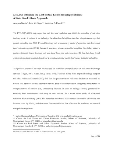 Nanda, A., Clapp, J. M. and Pancak, K. A. (2016) Do laws influence the cost of real estate brokerage services? A state fixed effects approach. Real Estate Economics, 44 (4). pp. 918-967. ISSN 1540-6229 doi: 10.1111/1540-6229.12124