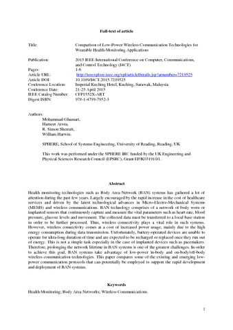 Comparison of low-power wireless communication technologies for wearable health-monitoring applications.