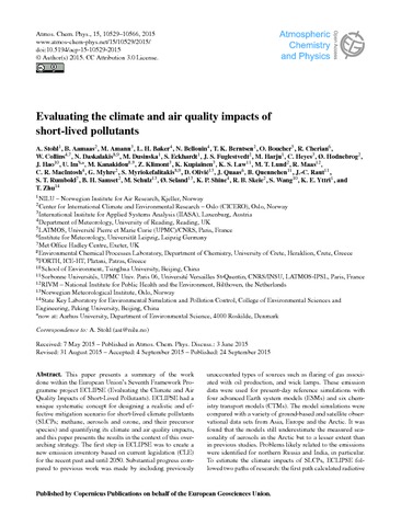 Stohl, A., Aamaas, B., Amann, M., Baker, L. orcid id iconORCID: https://orcid.org/0000-0003-0738-9488, Bellouin, N. orcid id iconORCID: https://orcid.org/0000-0003-2109-9559, Berntsen, T. K., Boucher, O., Cherian, R., Collins, W. orcid id iconORCID: https://orcid.org/0000-0002-7419-0850, Daskalakis, N., Dusinska, M., Eckhardt, S., Fuglestvedt, J. S., Harju, M., Heyes, C., Hodnebrog, Ø., Hao, J., Im, U., Kanakidou, M., Klimont, Z., Kupiainen, K., Law, K. S., Lund, M. T., Maas, R., MacIntosh, C., Myhre, G., Myriokefalitakis, S., Olivié, D., Quaas, J., Quennehen, B., Raut, J.-C., Rumbold, S. T., Samset, B. H., Schulz, M., Seland, Ø., Shine, K. orcid id iconORCID: https://orcid.org/0000-0003-2672-9978, Skeie, R. B., Wang, S., Yttri, K. E. and Zhu, T. (2015) Evaluating the climate and air quality impacts of short-lived pollutants. Atmospheric Chemistry and Physics, 15 (18). pp. 10529-10566. ISSN 1680-7316 doi: 10.5194/acp-15-10529-2015