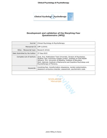 Morphing fears (also called transformation obsessions) involve concerns that a person may become contaminated by and acquire undesirable characteristics of others. These symptoms are found in patients with OCD and are thought to be related to mental contamination. Given the high levels of distress and interference morphing fears can cause, a reliable and valid assessment measure is needed. This article describes the development and evaluation of the Morphing Fear Questionnaire (MFQ), a 13-item measure designed to assess for the presence and severity of morphing fears. A sample of 900 participants took part in the research. Of these, 140 reported having a current diagnosis of OCD (SR-OCD) and 760 reported never having had OCD (N-OCD; of whom 24 reported a diagnosis of an anxiety disorder and 23 reported a diagnosis of depression). Factor structure, reliability, and construct and criterion related validity were investigated. Exploratory and confirmatory factor analyses supported a one-factor structure replicable across the N-OCD and SR-OCD group. The MFQ was found to have high internal consistency and good temporal stability, and showed significantly greater associations with convergent measures (assessing obsessive-compulsive symptoms, mental contamination, thought-action fusion and magical thinking) than with divergent measures (assessing depression and anxiety). Moreover, the MFQ successfully discriminated between the SR-OCD sample and the N-OCD group, anxiety disorder sample, and depression sample. These findings suggest that the MFQ has sound psychometric properties and that it can be used to assess morphing fear. Clinical implications are discussed.