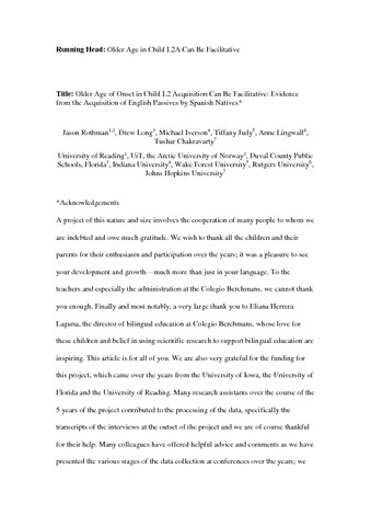 Rothman, J., Long, D., Iverson, M., Judy, T., Lingwall, A. and Chakravarty, T. (2016) Older age of onset in child L2 acquisition can be facilitative: evidence from the acquisition of English passives by Spanish natives. Journal of Child Language, 43 (3). pp. 662-686. ISSN 0305-0009 doi: 10.1017/S0305000915000549