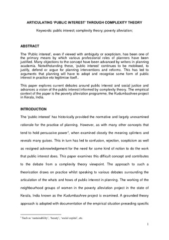 The ‘Public interest’, even if viewed with ambiguity or scepticism, has been one of the primary means by which various professional roles of planners have been justified. Many objections to the concept have been advanced by writers in planning academia. Notwithstanding these, ‘public interest’ continues to be mobilised, to justify, defend or argue for planning interventions and reforms. This has led to arguments that planning will have to adopt and recognise some form of public interest in practice to legitimise itself.. This paper explores current debates around public interest and social justice and advances a vision of the public interest informed by complexity theory. The empirical context of the paper is the poverty alleviation programme, the Kudumbashree project in Kerala, India.
