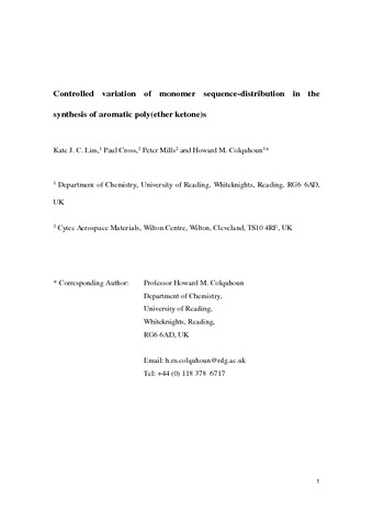 Lim, K. J. C., Cross, P., Mills, P. and Colquhoun, H. M. (2016) Controlled variation of monomer sequence-distribution in the synthesis of aromatic poly(ether ketone)s. High Performance Polymers, 28 (8). pp. 984-992. ISSN 1361-6412 doi: 10.1177/0954008315612140