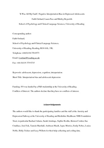 Orchard, F., Pass, L. and Reynolds, S. (2016) ‘It was all my fault’: negative interpretation bias in depressed adolescents. Journal of Abnormal Child Psychology, 44 (5). pp. 991-998. ISSN 0091-0627 doi: 10.1007/s10802-015-0092-x