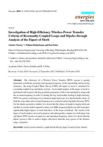 Investigation of high-efficiency Wireless Power Transfer criteria of resonantly-coupled loops and dipoles through analysis of the figure of merit.