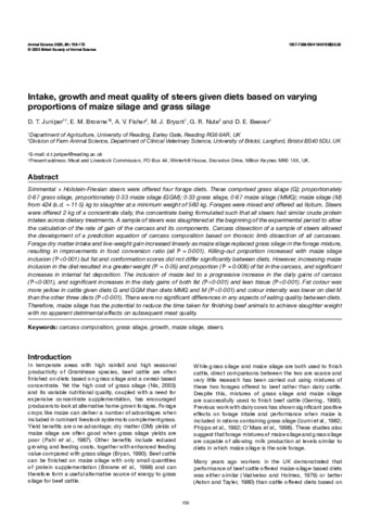 Juniper, D. T., Browne, E. M., Fisher, A., Bryant, M. J., Nute, G. and Beever, D. (2005) Intake, growth and meat quality of steers given diets based on varying proportions of maize silage and grass silage. Animal Science, 81. pp. 159-170. ISSN 1357-7298
