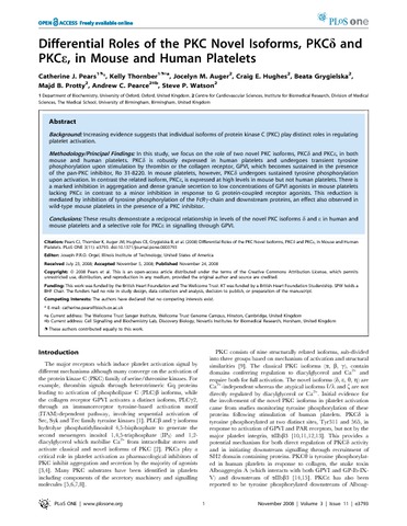 Background Increasing evidence suggests that individual isoforms of protein kinase C (PKC) play distinct roles in regulating platelet activation. Methodology/Principal Findings In this study, we focus on the role of two novel PKC isoforms, PKCδ and PKCε, in both mouse and human platelets. PKCδ is robustly expressed in human platelets and undergoes transient tyrosine phosphorylation upon stimulation by thrombin or the collagen receptor, GPVI, which becomes sustained in the presence of the pan-PKC inhibitor, Ro 31-8220. In mouse platelets, however, PKCδ undergoes sustained tyrosine phosphorylation upon activation. In contrast the related isoform, PKCε, is expressed at high levels in mouse but not human platelets. There is a marked inhibition in aggregation and dense granule secretion to low concentrations of GPVI agonists in mouse platelets lacking PKCε in contrast to a minor inhibition in response to G protein-coupled receptor agonists. This reduction is mediated by inhibition of tyrosine phosphorylation of the FcRγ-chain and downstream proteins, an effect also observed in wild-type mouse platelets in the presence of a PKC inhibitor. Conclusions These results demonstrate a reciprocal relationship in levels of the novel PKC isoforms δ and ε in human and mouse platelets and a selective role for PKCε in signalling through GPVI.
