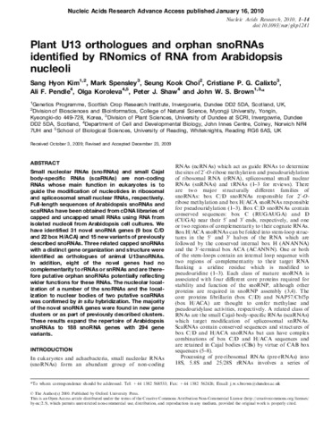 Kim, S. H., Spensley, M., Choi, S. K., Calixto, C., Pendle, A., Koroleva, O., Shaw, P. J. and Brown, J. W. S. (2010) Plant U13 orthologues and orphan snoRNAs identified by RNomics of RNA from Arabidopsis nucleoli. Nucleic Acids Research, 38 (9). pp. 3054-3067. ISSN 1362-4962 doi: 10.1093/nar/gkp1241