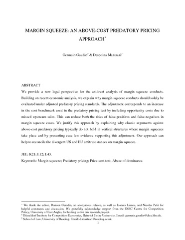 Gaudin, G. and Mantzari, D. (2016) Margin squeeze: an above cost predatory pricing approach. Journal of Competition Law and Economics, 12 (1). pp. 151-179. ISSN 1744-6422 doi: 10.1093/joclec/nhv042