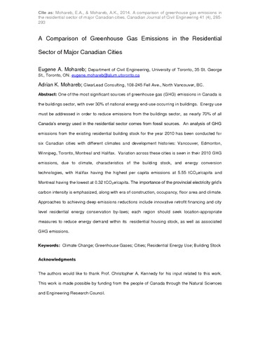 One of the most significant sources of greenhouse gas (GHG) emissions in Canada is the buildings sector, with over 30% of national energy end-use occurring in buildings. Energy use must be addressed to reduce emissions from the buildings sector, as nearly 70% of all Canada’s energy used in the residential sector comes from fossil sources. An analysis of GHG emissions from the existing residential building stock for the year 2010 has been conducted for six Canadian cities with different climates and development histories: Vancouver, Edmonton, Winnipeg, Toronto, Montreal, and Halifax. Variation across these cities is seen in their 2010 GHG emissions, due to climate, characteristics of the building stock, and energy conversion technologies, with Halifax having the highest per capita emissions at 5.55 tCO2e/capita and Montreal having the lowest at 0.32 tCO2e/capita. The importance of the provincial electricity grid’s carbon intensity is emphasized, along with era of construction, occupancy, floor area, and climate. Approaches to achieving deep emissions reductions include innovative retrofit financing and city level residential energy conservation by-laws; each region should seek location-appropriate measures to reduce energy demand within its residential housing stock, as well as associated GHG emissions.
