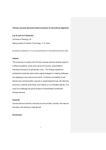 Ye, L. and Edwards, V. (2015) Chinese overseas doctoral student narratives of intercultural adaptation. Journal of Research in International Education, 14 (3). pp. 228-241. ISSN 1741-2943 doi: 10.1177/1475240915614934