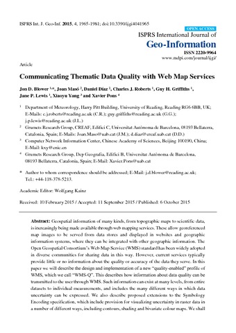 Geospatial information of many kinds, from topographic maps to scientific data, is increasingly being made available through web mapping services. These allow georeferenced map images to be served from data stores and displayed in websites and geographic information systems, where they can be integrated with other geographic information. The Open Geospatial Consortium’s Web Map Service (WMS) standard has been widely adopted in diverse communities for sharing data in this way. However, current services typically provide little or no information about the quality or accuracy of the data they serve. In this paper we will describe the design and implementation of a new “quality-enabled” profile of WMS, which we call “WMS-Q”. This describes how information about data quality can be transmitted to the user through WMS. Such information can exist at many levels, from entire datasets to individual measurements, and includes the many different ways in which data uncertainty can be expressed. We also describe proposed extensions to the Symbology Encoding specification, which include provision for visualizing uncertainty in raster data in a number of different ways, including contours, shading and bivariate colour maps. We shall also describe new open-source implementations of the new specifications, which include both clients and servers.
