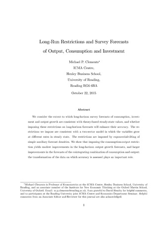 Clements, M. P. orcid id iconORCID: https://orcid.org/0000-0001-6329-1341 (2016) Long-run restrictions and survey forecasts of output, consumption and investment. International Journal of Forecasting, 32 (3). pp. 614-628. ISSN 0169-2070 doi: 10.1016/j.ijforecast.2015.10.005