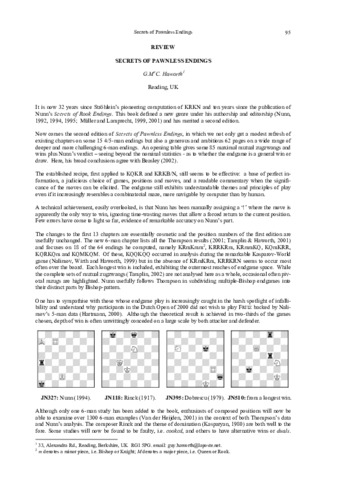 It is now 32 years since Ströhlein’s pioneering computation of KRKN and ten years since the publication of Nunn’s Secrets of Rook Endings. This book defined a new genre under his authorship and editorship (Nunn, 1992, 1994, 1995; Müller and Lamprecht, 1999, 2001) and has merited a second edition. Now comes the second edition of Secrets of Pawnless Endings.