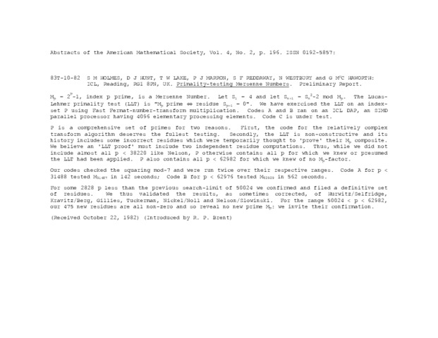 Holmes, S. M., Hunt, D. J., Lake, T. W., Marron, P. J., Reddaway, S. F., Westbury, N. and Haworth, G. M. orcid id iconORCID: https://orcid.org/0000-0001-9896-1448 (1983) Primality-testing Mersenne numbers. Abstracts of papers presented to the American Mathematical Society, 4 (2). p. 196. ISSN 0192-5857