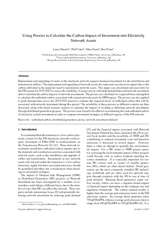 Daniels, L., Coker, P., Gunn, A. and Potter, B. (2016) Using proxies to calculate the carbon impact of investment into electricity network assets. Applied Energy, 162. pp. 551-560. ISSN 0306-2619 doi: 10.1016/j.apenergy.2015.10.111